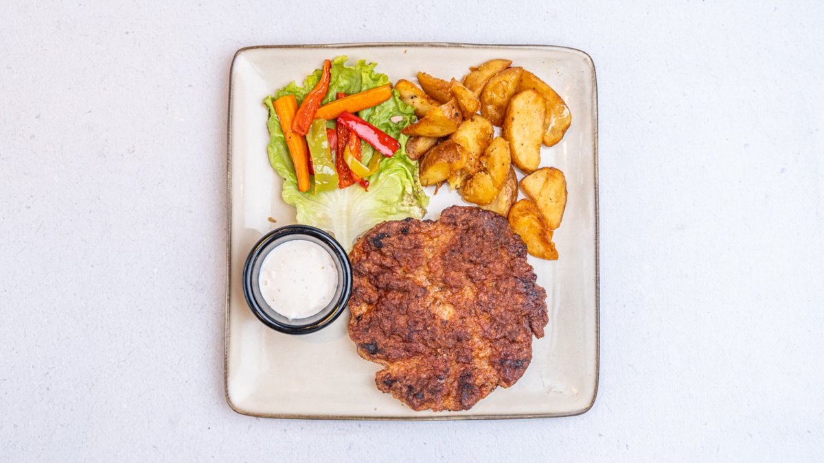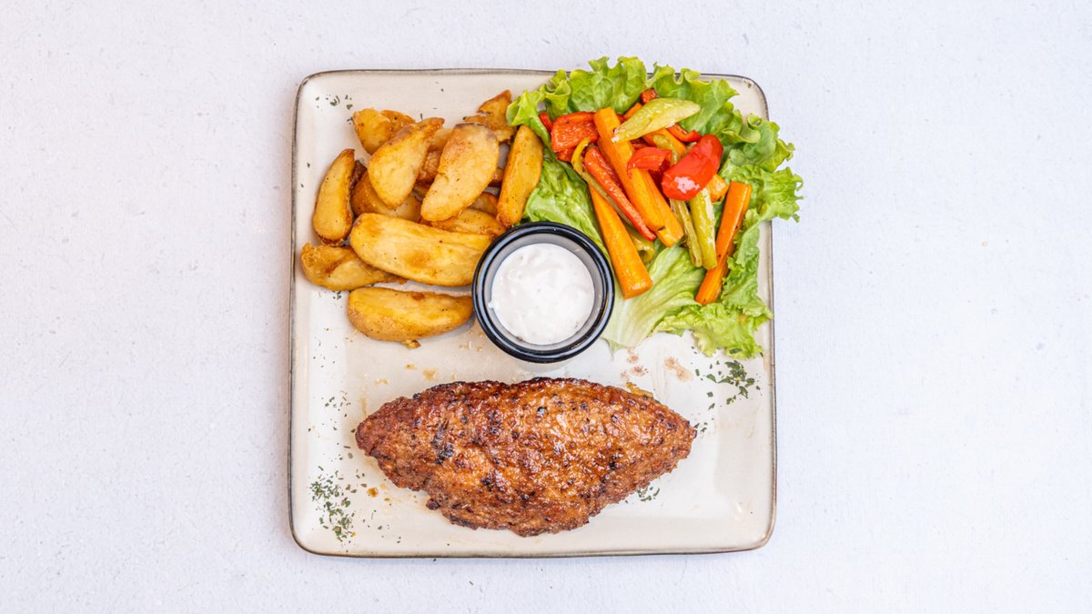 Pleskavicë, patate, perime të freskëta & sos kërpudhash