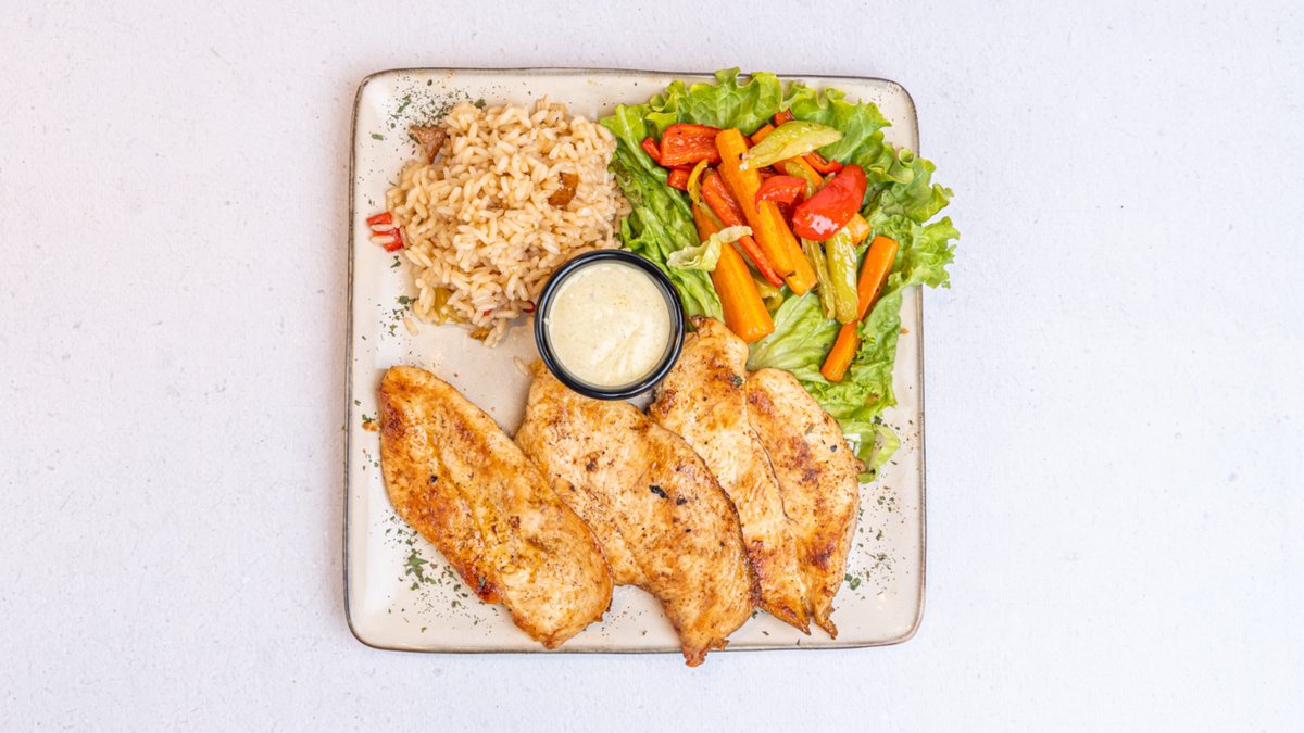 Mish i pulës, sallatë e gjelbërt, domate, tranguj & sos, sallatë