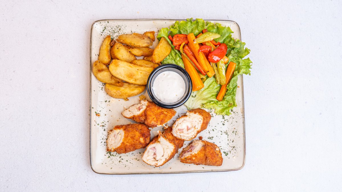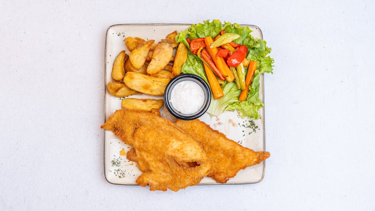 Bukë shtëpie, mish pule në prezlie & sallatë, servohet me pomfrit & sos