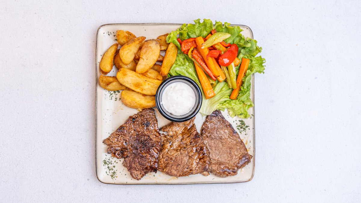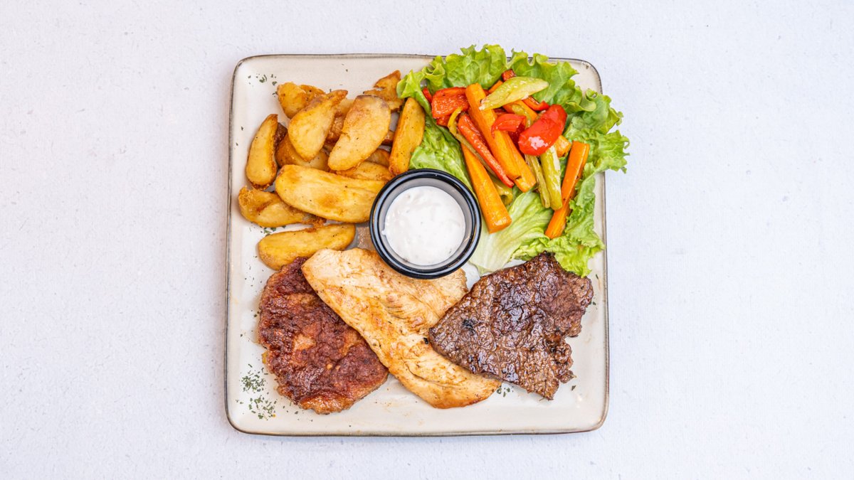 Ramstek, file pule, pleskavicë, patate, perime të freskëta & sos kërpudhash