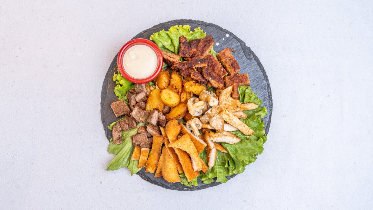 Mish viç, mish pule, chicken fingers, pleskavicë, patate, kërpudha & dy lloje sosi