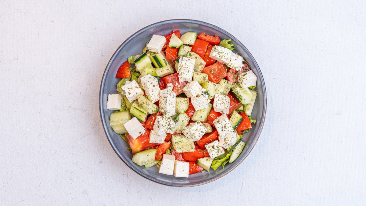 Sallatë e gjelbërt, djathë i grimcuar domate, tranguj