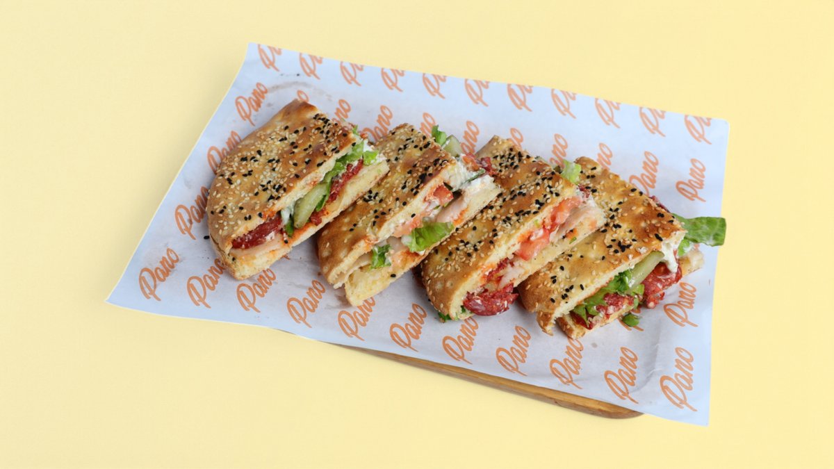 Bukë e shpisë e pjekur me susam, farë e zezë, proshutë pule e tymosur, sallatë jeshile, domate, tranguj turshi, djath sos pano