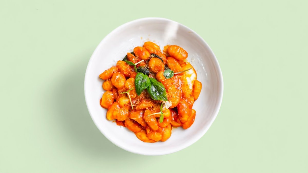 Gnocchi, salcë domatesh, mozzarella, borzilok