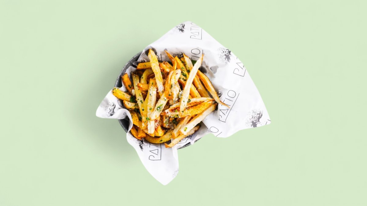 Pomfrit, vaj tartufi, majdanoz, parmixhano