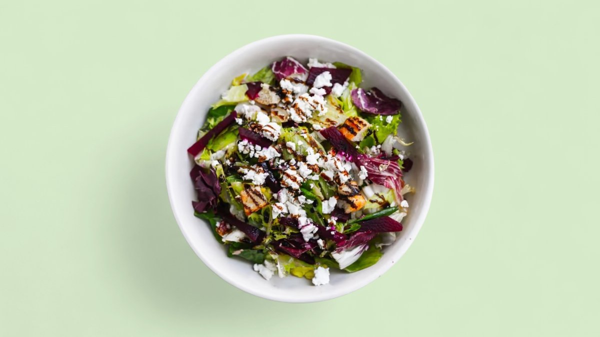 Iceberg, rukola, icberg, lakër e kuqe, djath dhie, krutona