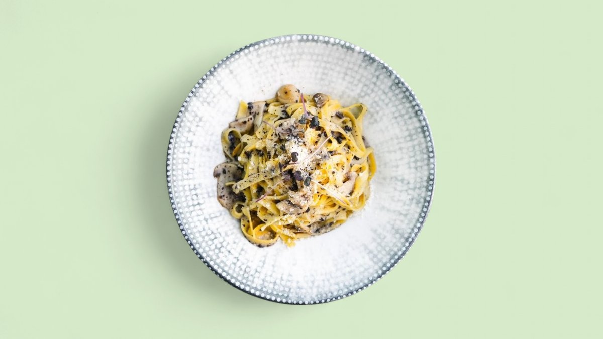 Tagliatelle, salcë tartufi, kërpudha, parmixhano, vaj hudhre