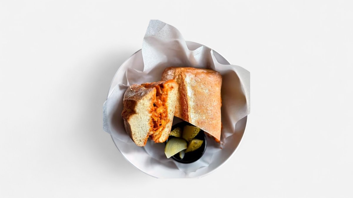 Chiabatta bread, chicken breast, chef's sauce, pickels.