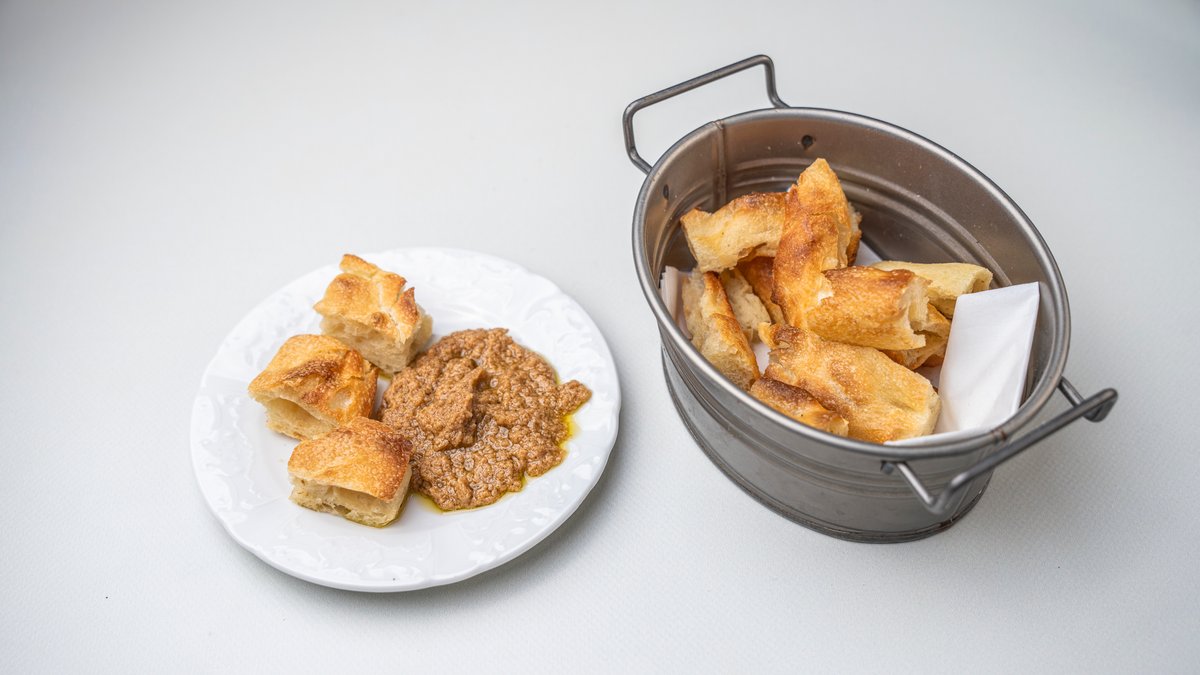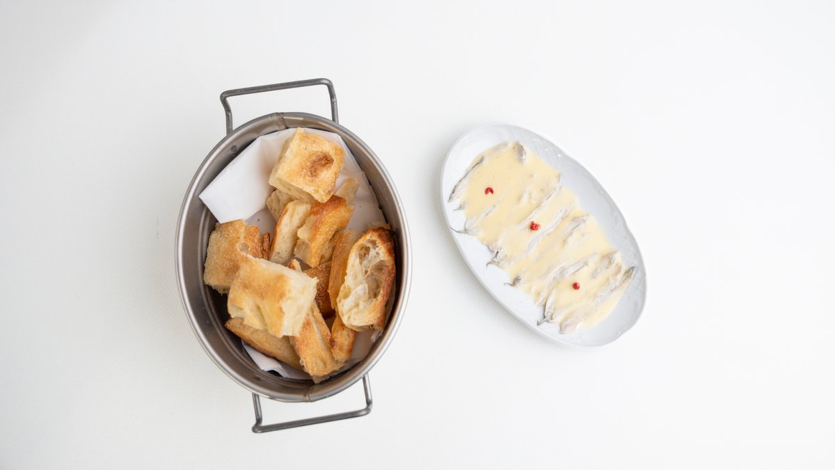 Açuge e marinuar me vaj ulliri extra virgin, lekurë limoni, bukë e thekur me vaj ulliri