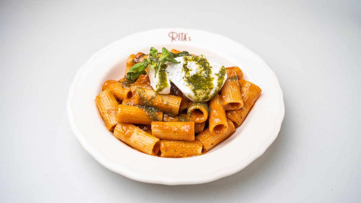 Rigatoni me salce domatesh & pesto borziloku, burrata & vaj basili