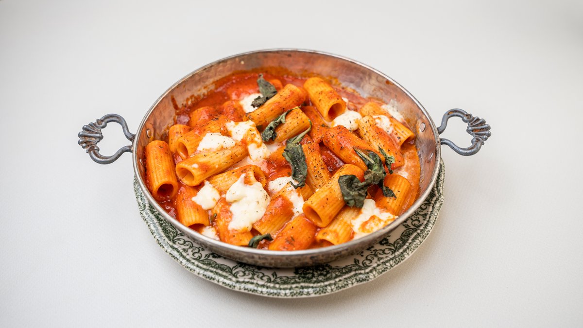 Rigatoni me salcë domatesh & pesto borziloku, krem mozarella, vaj basili