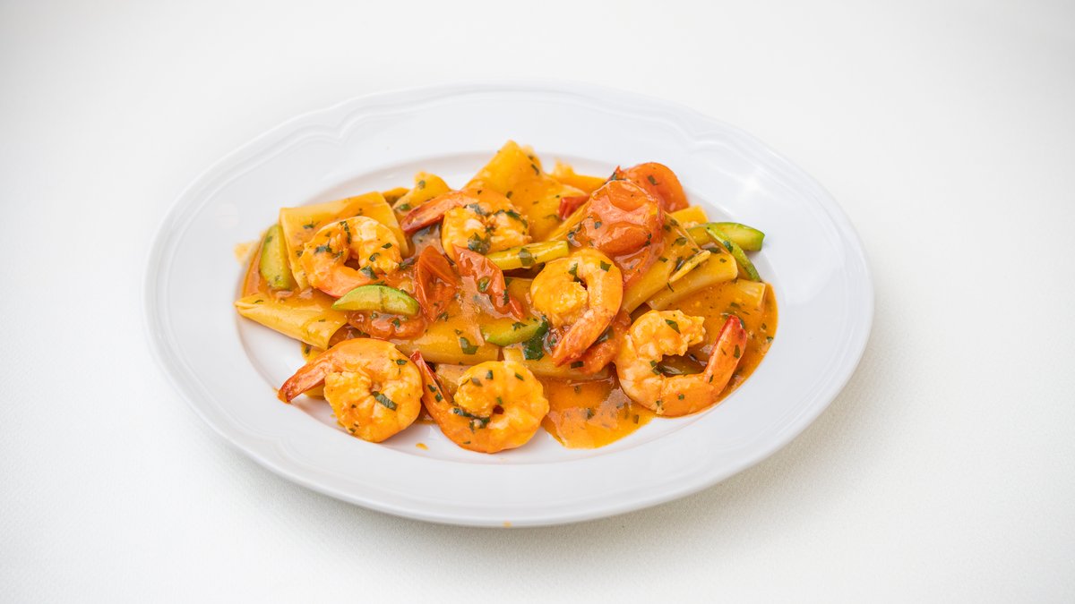 Paccheri me karkalec, kungulleshë, domatina, verë të bardhë