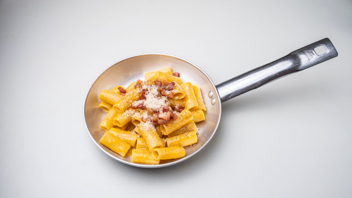 Rigatoni, e kuqja e vezës, pecorino romano, guanciale, piper të zi