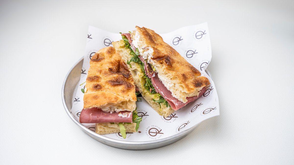 Mocarella, proshutë viçi, rikota, krem fësteku, rukolla dhe vaj ulliri extra virgin