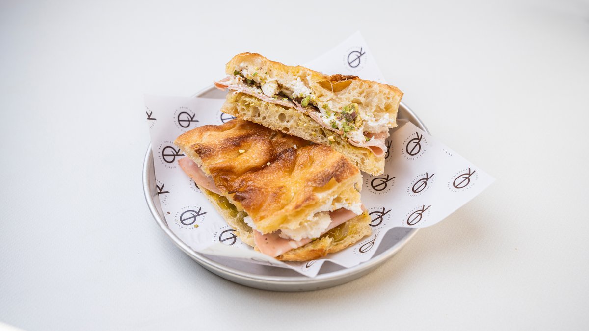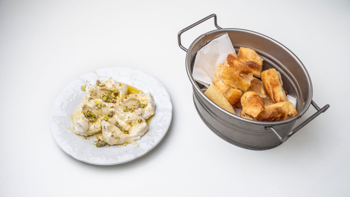 Mortadella, rikota, krem fëstëku, burrata, fëstëk, vaj ulliri extra virgin