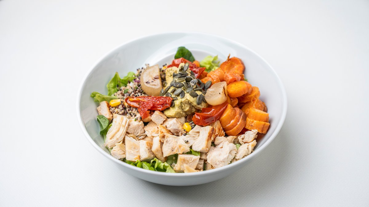 Mish pule, sallatë e gjelbër domate e thatë, spinaq, quinoa, qepë turshi, guacamole, karrota konfit, arra, bukë e thekur