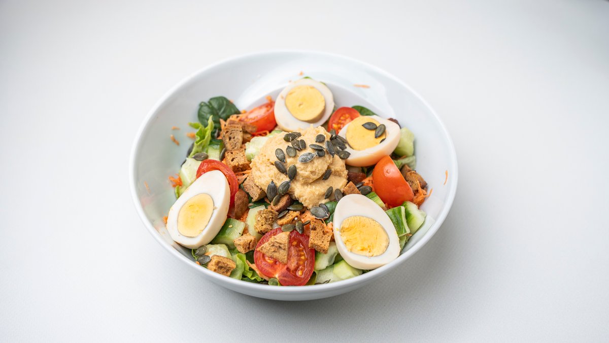 Sallatë e gjelbër spinaq, tranguj, vezë e zier, karrotë, kërpudha, domatina, humus