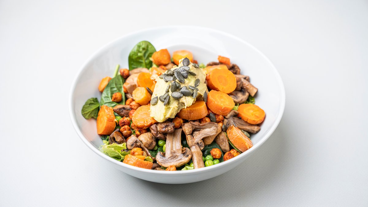 Sallatë e gjelbër spinaq, guacamole, karrotë konfit, kërpudha, bizele, qiqra