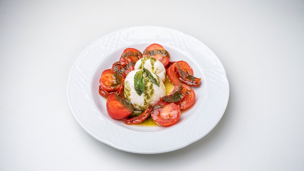 Burrata e shërbyer me domatina, borzilok, vaj ulliri extra virgin