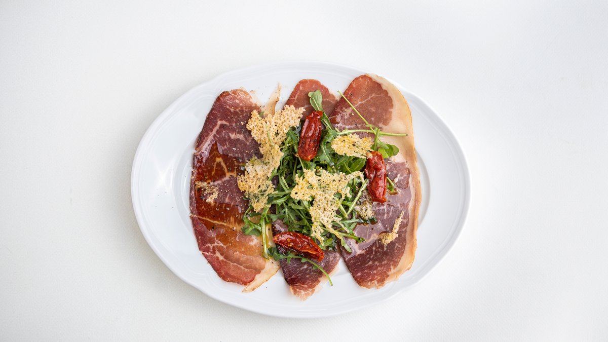 Carpaccio nga mishi i viçit Black Angus, rukolla, domate gjysmë e thatë