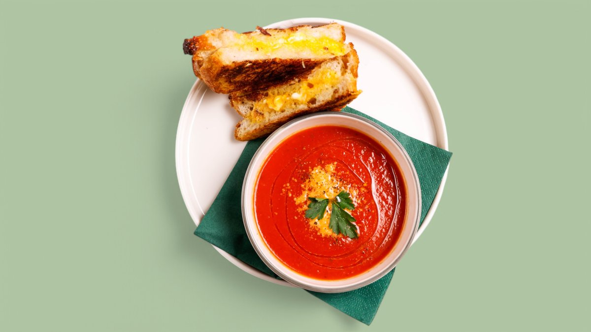 Sanduiç me djathë gouda dhe çedar të shkrirë, e shoqëruar me supë domatesh