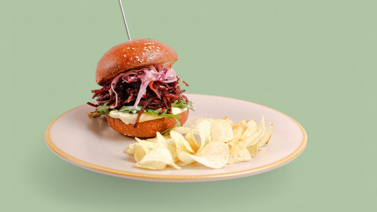 Kërpudha king oyster të gatuara në salcë barbeque, shërbyer në bukë brioche me rukollë, majonezë me mjaltë dhe mustardë, sallatë me lakra
