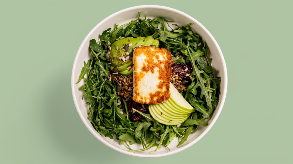 Rukollë, thjerëza, quinoa, domate e tharë n'vaj ulliri, mollë, avokado, djathë halloumi, fara t'ndryshme