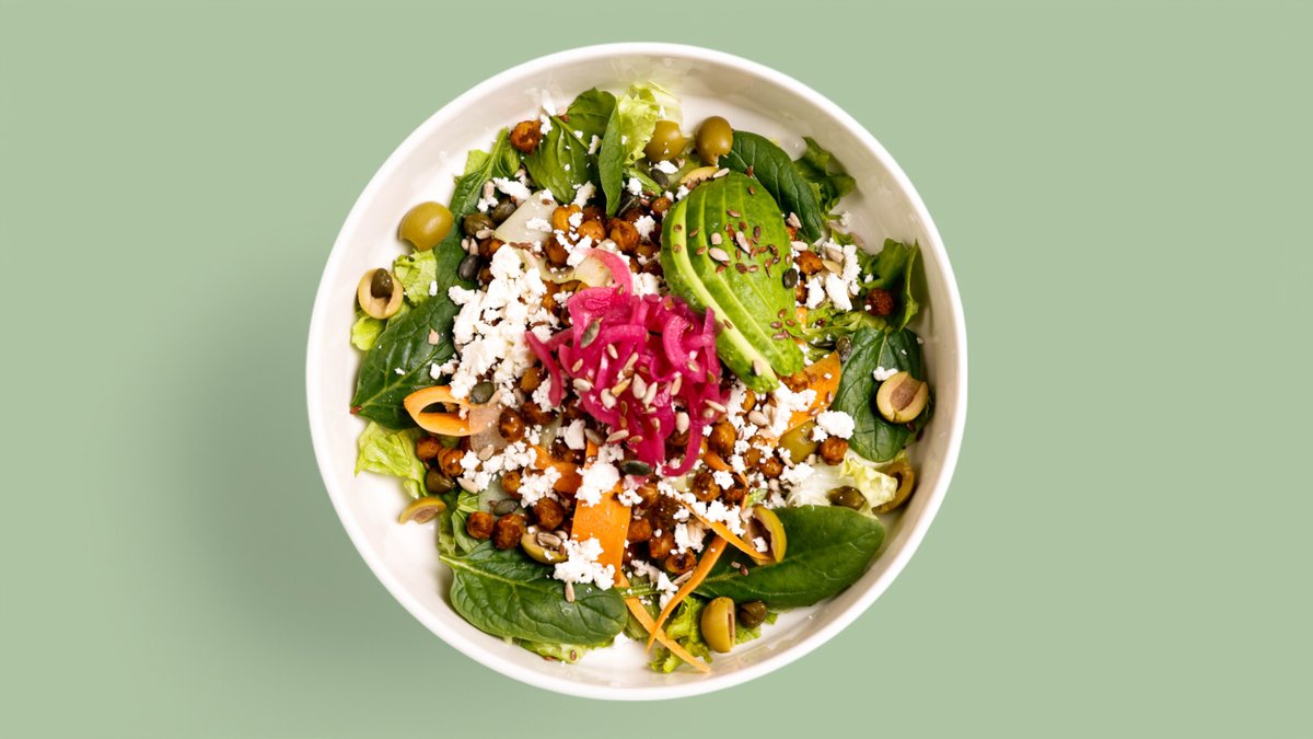 T'gjelbra t'ndryshme, karrotë, tranguj, ullinj, kaperi, avokado, djathë feta, qiqra, qepë e kuqe turrshi, fara t'ndryshme