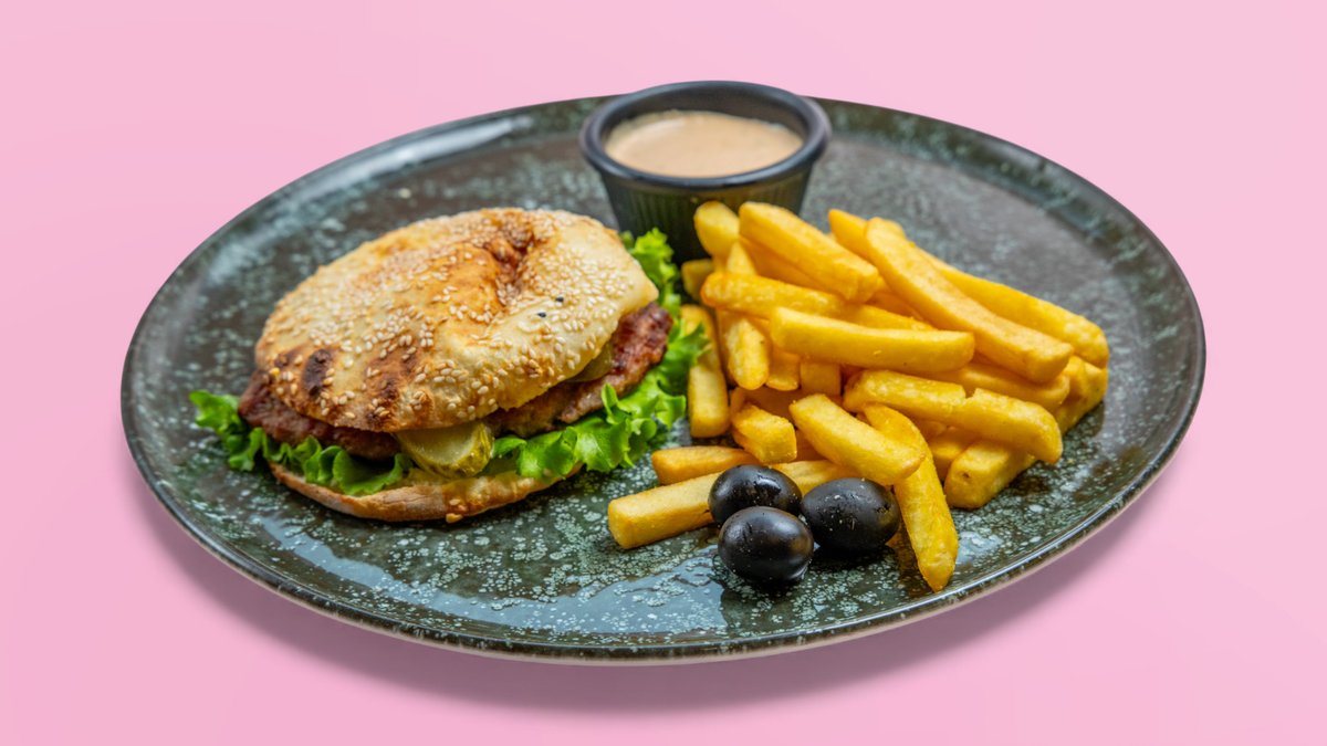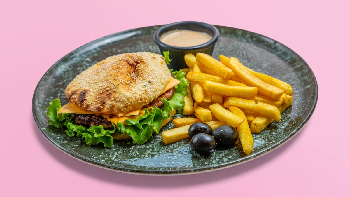 Pleskavicë, cheddar, domate, tranguj, sallatë, sos, pomfrit