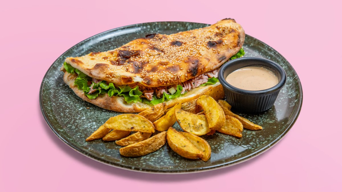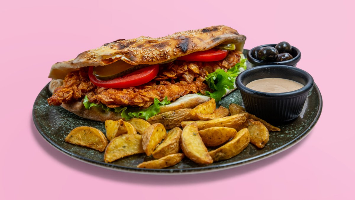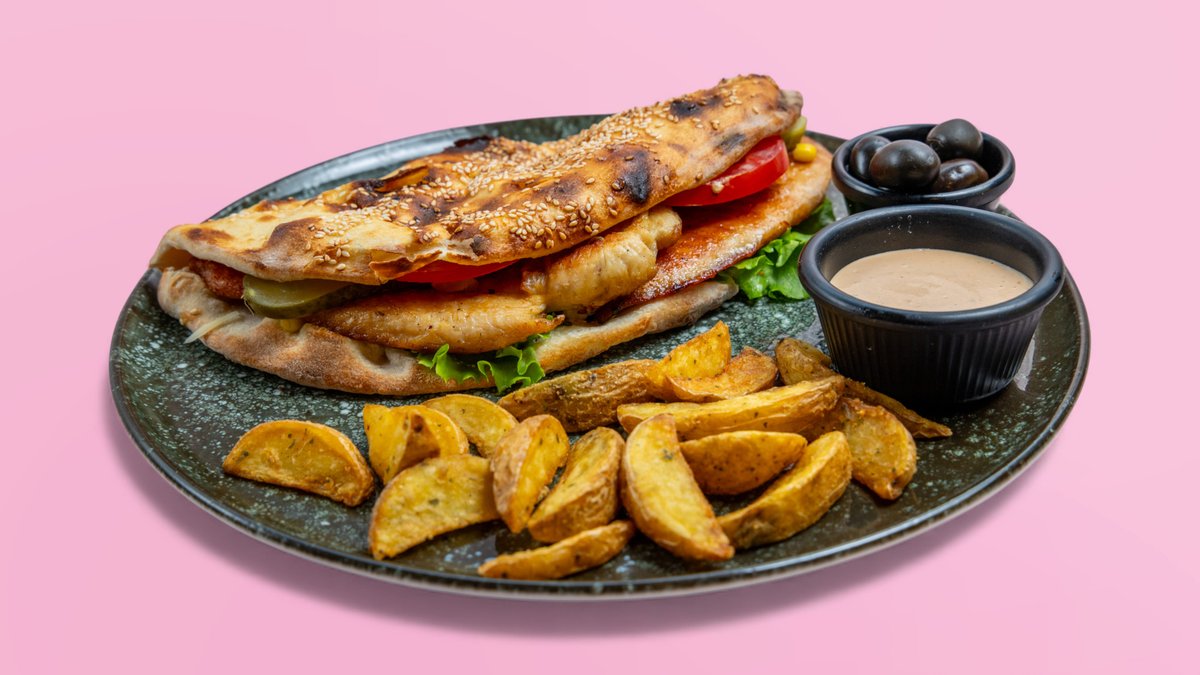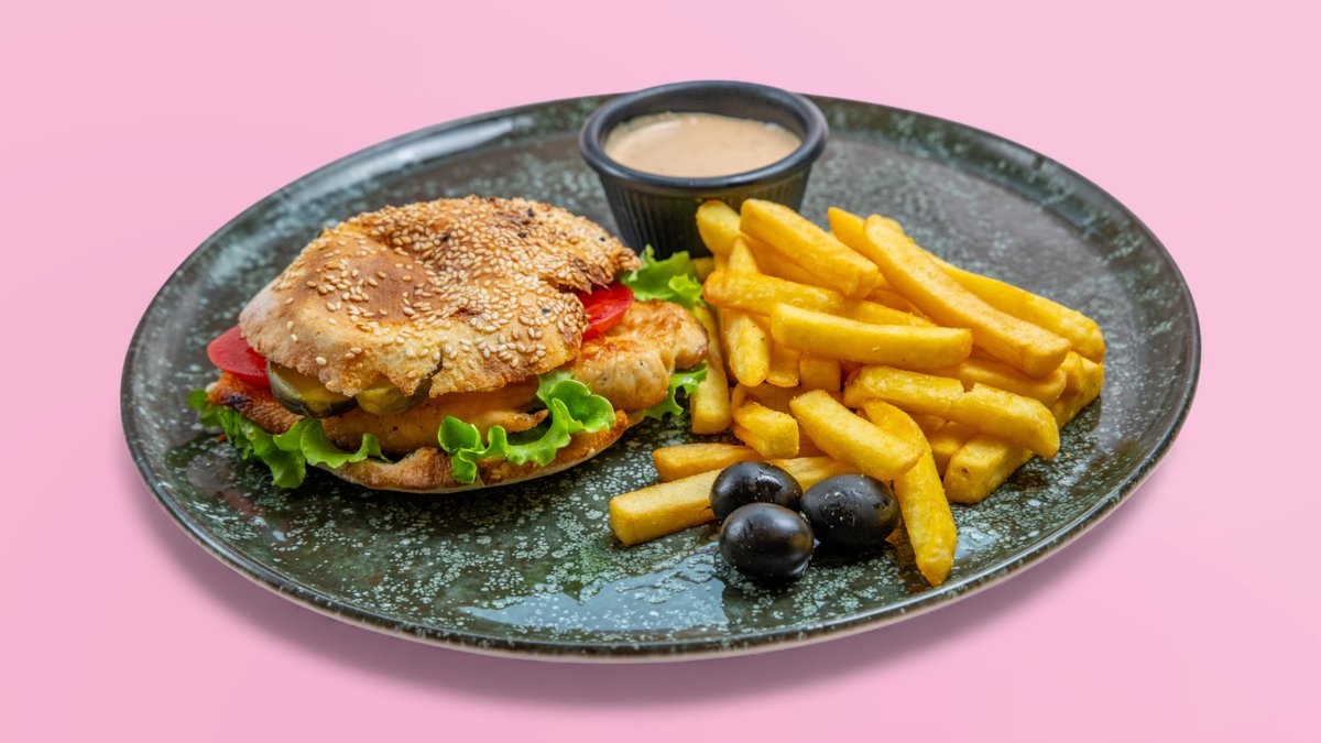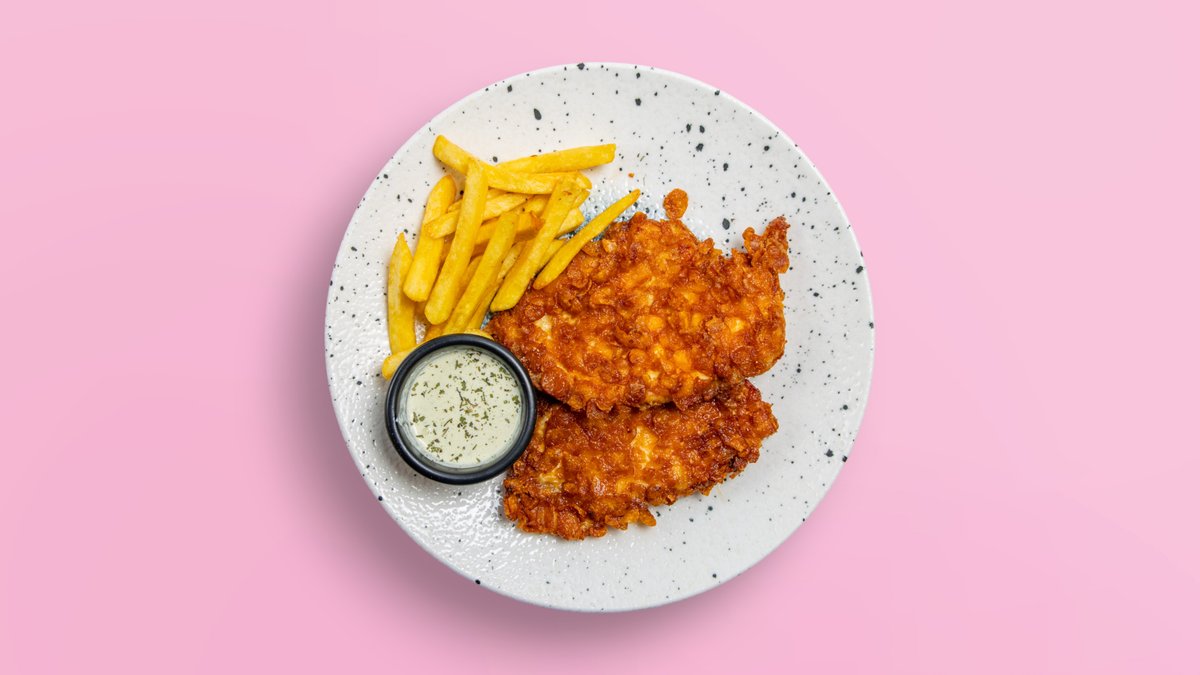 Mish pule crunch, kaçkavall, domate, tranguj. sallatë, sos, pomfrit