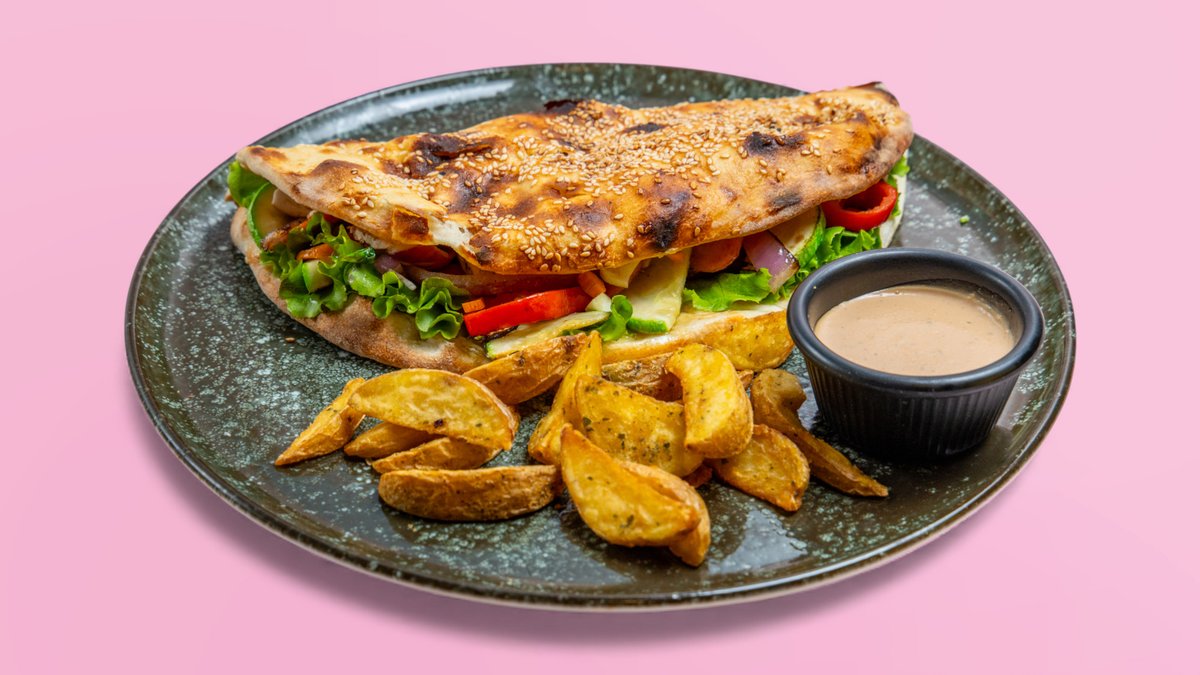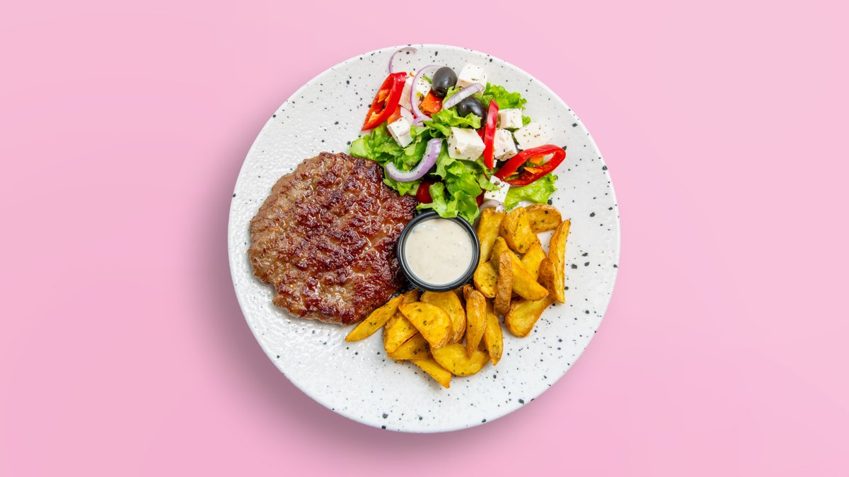 Pleskavicë, domate, tranguj, sallatë, sos