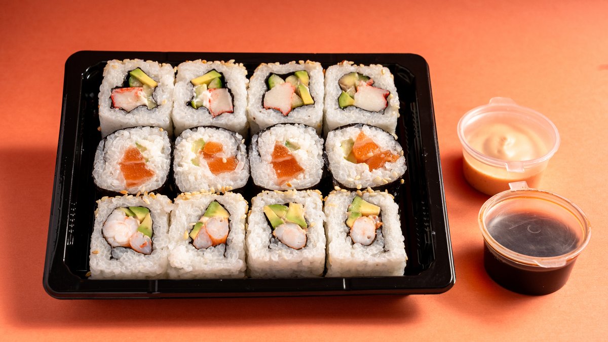 Salmon maki, california, shrimp roll, salcë pikante dhe soje