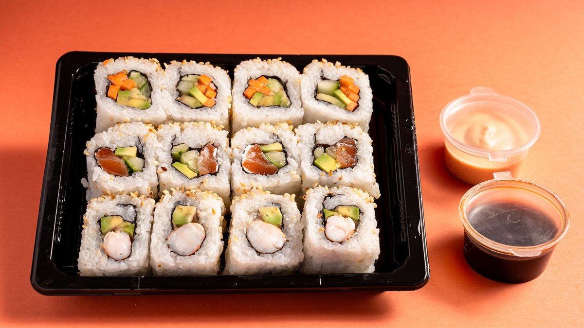Philadelphia, shrimp, vegetarian roll, salcë pikante dhe soje
