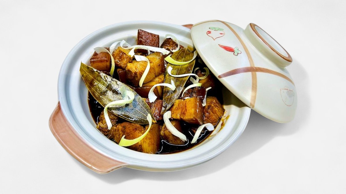Tender pork belly slowly braised in a savory and tangy blend of soy sauce, cane vinegar, garlic, bay leaves, and black peppercorns to absorb layers of rich, savory, and tangy flavors. Served with rice.
