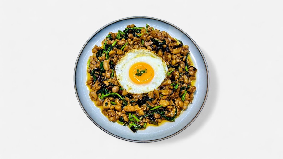 Tender chicken stir-fried with aromatic Thai holy basil, garlic, and fiery chilies, tossed in savory-sweet blend of soy, fish, and oyster sauces, topped with golden and crispy fried egg. Served with rice.