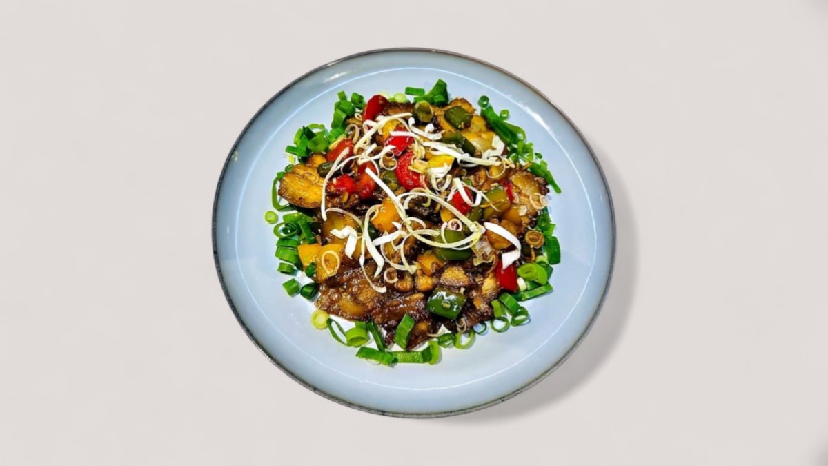 Sliced pork belly simmered until tender and stir-fried in Sichuan fermented bean paste and soy sauce with onion, bell peppers, garlic and ginger. Served with rice.