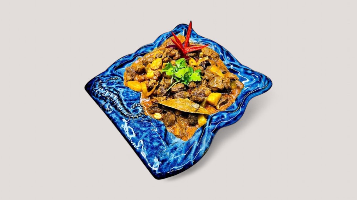 Tender chunks of beef slow-cooked in creamy coconut milk-based sauce with potatoes and peanuts and warming spices, the sweetness and creaminess balanced by a subtle hint of tamarind or lime. Served with rice.