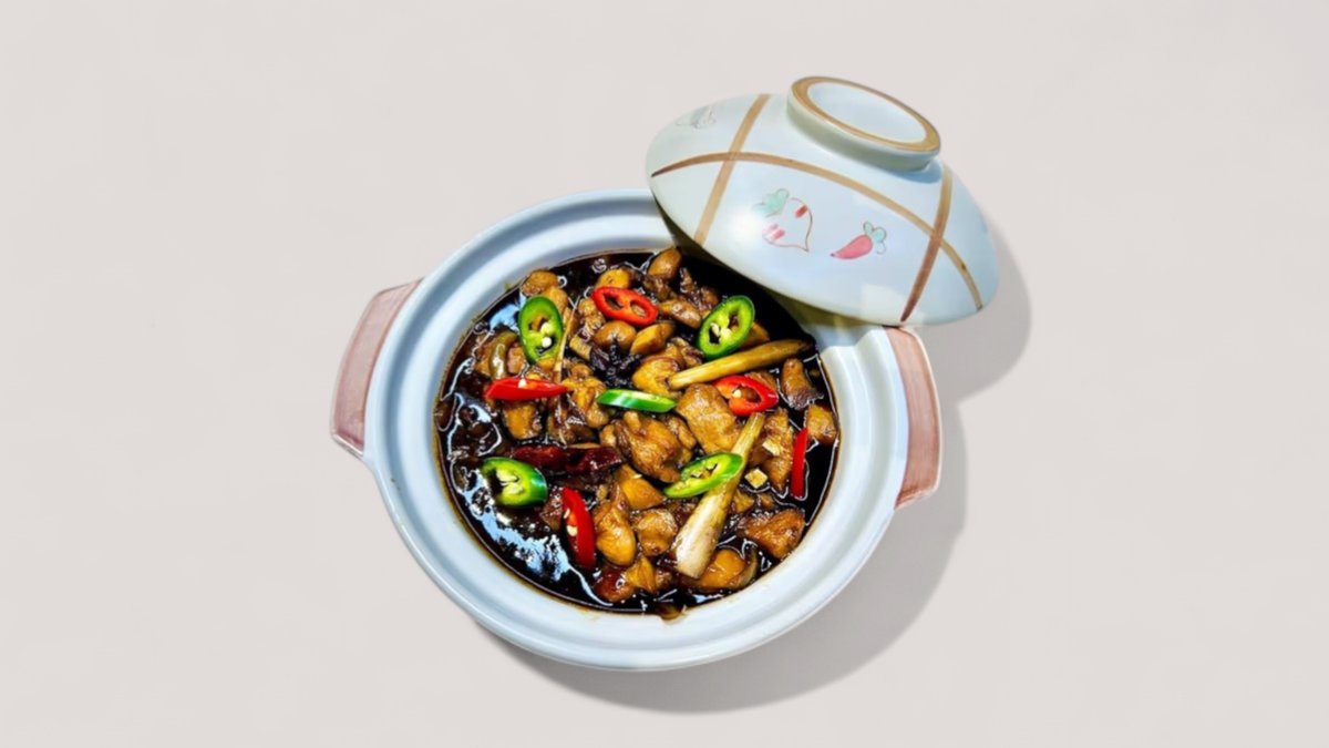 Succulent chicken pieces simmered in rich and dark soy sauce with garlic, onions, and fragrant spices, each bite coated in glossy, caramelized glaze by the slightly sweetness and spiciness. Served with rice.