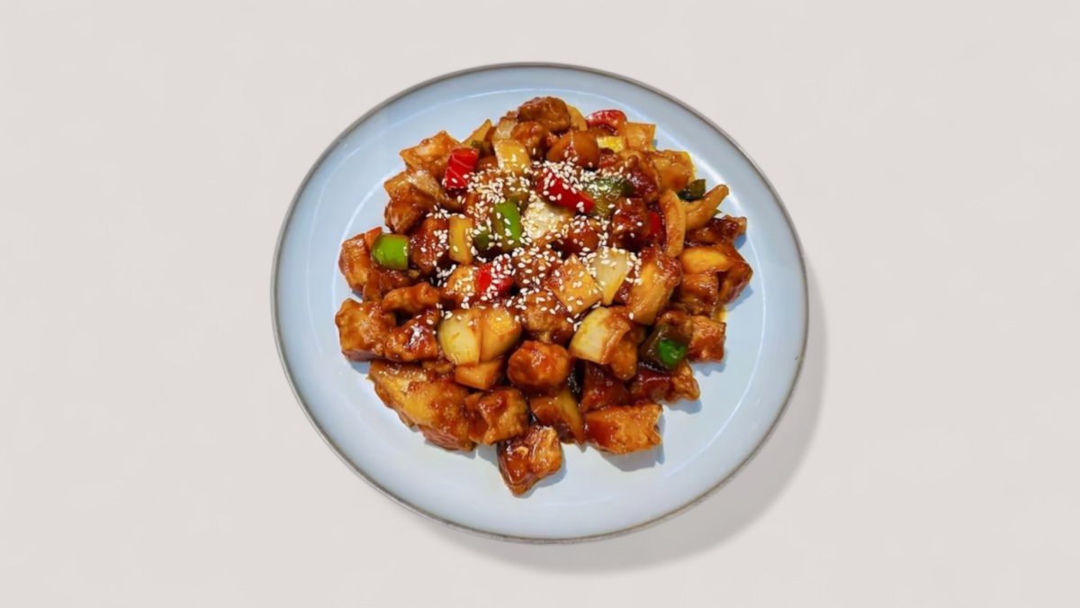 Tofu pan-fried until golden and crispy on the outside, simmered in a flavorful sauce made from soy sauce, garlic, ginger, and vinegar or sugar, added by bell peppers and black fungus. Served with rice.