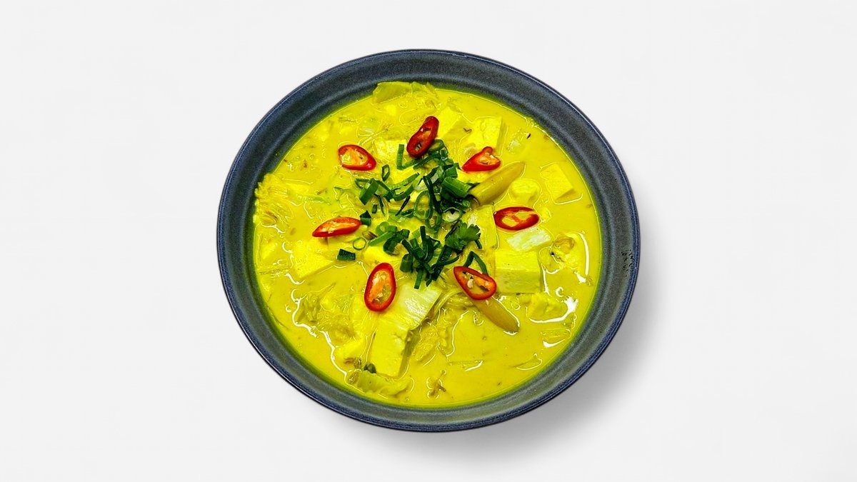 Tender tofu and amedley of fresh vegetables simmered in creamy and mildly spiced coconut milk-based broth, infused with aromatic spices such as lemongrass, galangal, and turmeric. Served with rice.