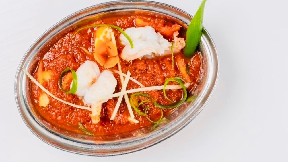 Yrtti-jogurttimarinoituja ja tandoori-uunissa grillattuja jättikatkarapuja lampaan sisäfilee paloja ja kanan rintafilee paloja paprika-, chili-, tomaatti-, inkivääri-, valkosipuli- ja masalakastikkeessa