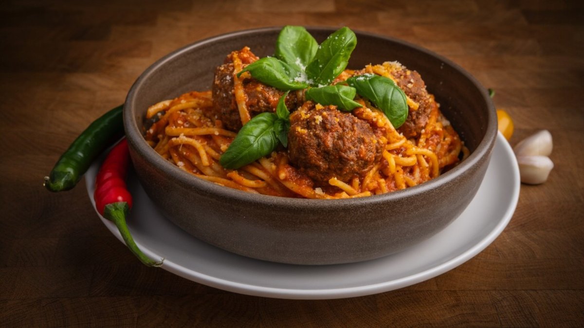 Häränlihapullia talon omalla reseptillä. Lisäksi linguine-pastaa, marinara-kastiketta, tuoretta basilikaa ja parmesanjuustoa
