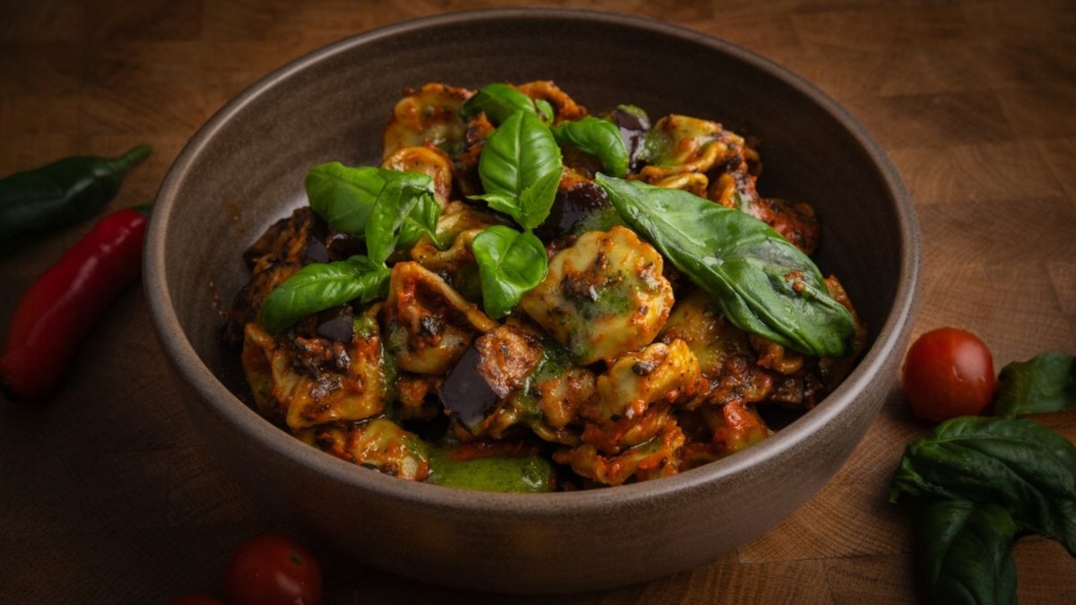 Pinaattiravioleja, paahdettua munakoisoa ja tuoretta basilikaa. Lisäksi marinara-kastiketta, paahdettua valkosipulia ja italialaista tryffelia.