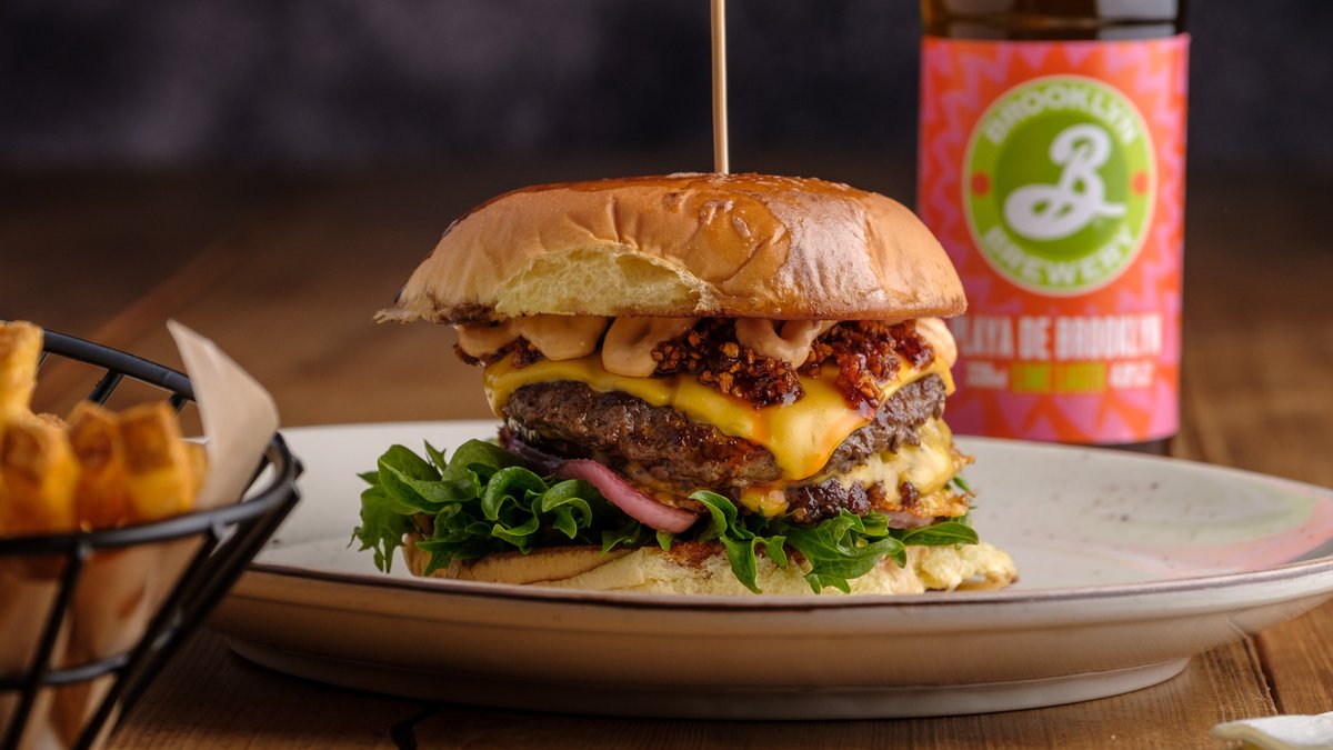 Perunasämpylän välissä kaksi (80g) burgerpihviä (FIN), paahdettua chili-valkosipulia, jalopenoja, cheddarjuustoa, marinoitua punasipulia, salaattia sekä chipotle-majoneesia. Lisäksi rapeita ranskalaisia.