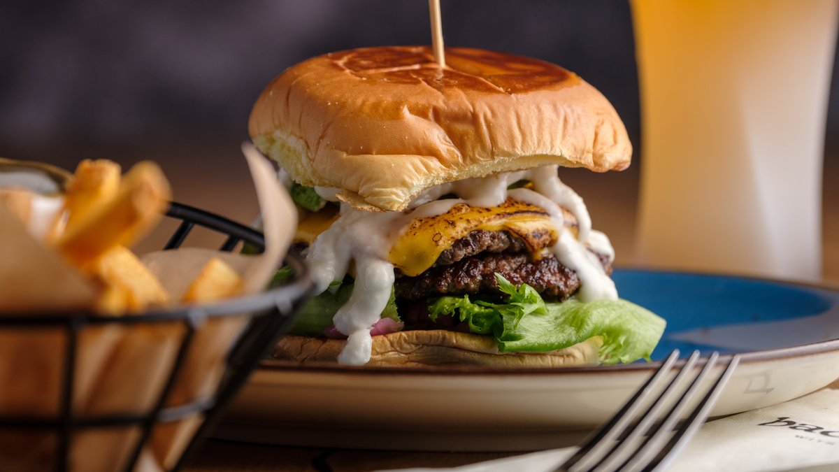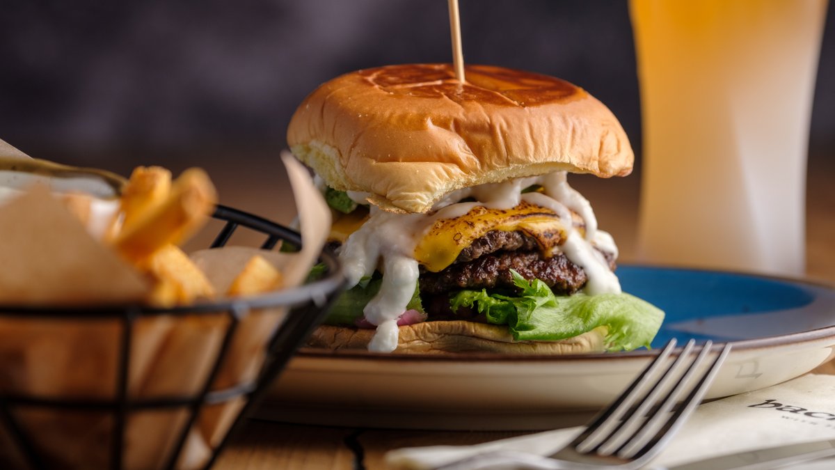 Perunasämpylän välissä kaksi (80g) burgerpihviä, rapeaa pekonia (FIN), cheddarjuustoa, maustekurkkua, marinoitua punasipulia, ranch-kastiketta, salaattia sekä cheddarkastiketta. Lisäksi rapeita ranskalaisia.