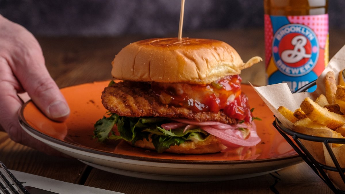 Perunasämpylän välissä paneroitu broilerin rintafilee, paistettua vuohenjuustoa, paholaisenhilloa, marinoitua punasipulia, salaattia sekä aiolia. Lisäksi rapeita ranskalaisia.
