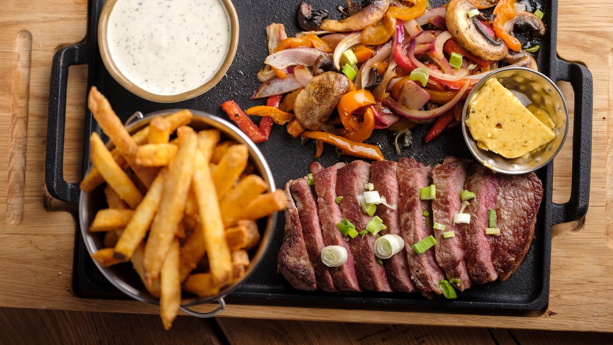 Grillattua pihvihärän ulkofiletta, paistettua sipulia paprikaa sekä herkkusieniä. Lisäksi ranskanperunoita, ranch-dippiä ja maustevoita.