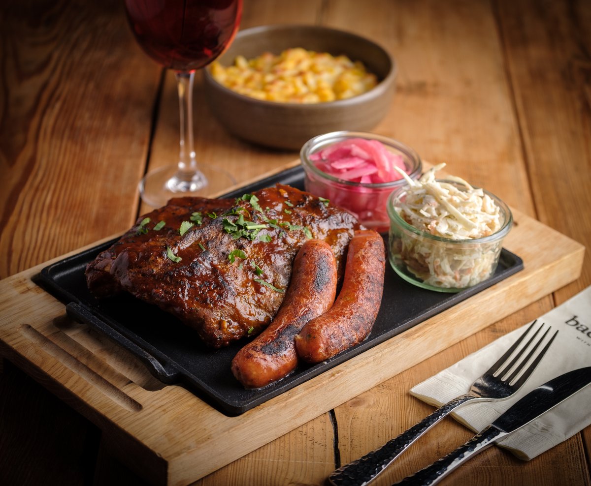 Reilu annos hitaasti kypsennettyjä baby ribsejä, jalapenomakkaraa ja coleslawth lisäksi black jack bbq-kastiketta, marinoitua punasipulia ja mac & cheese.