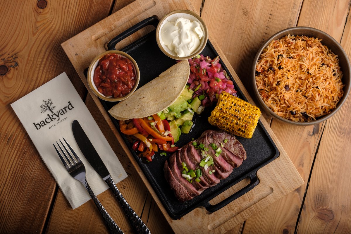 Grillattua pihvihärän ulkofilettä (200g), paistettua papu-riisiä, paprikaa ja makeaa maissia. Lisäksi avokadoa, ranskankermaa, salsaa, pico de galloa ja tortillaleipää.