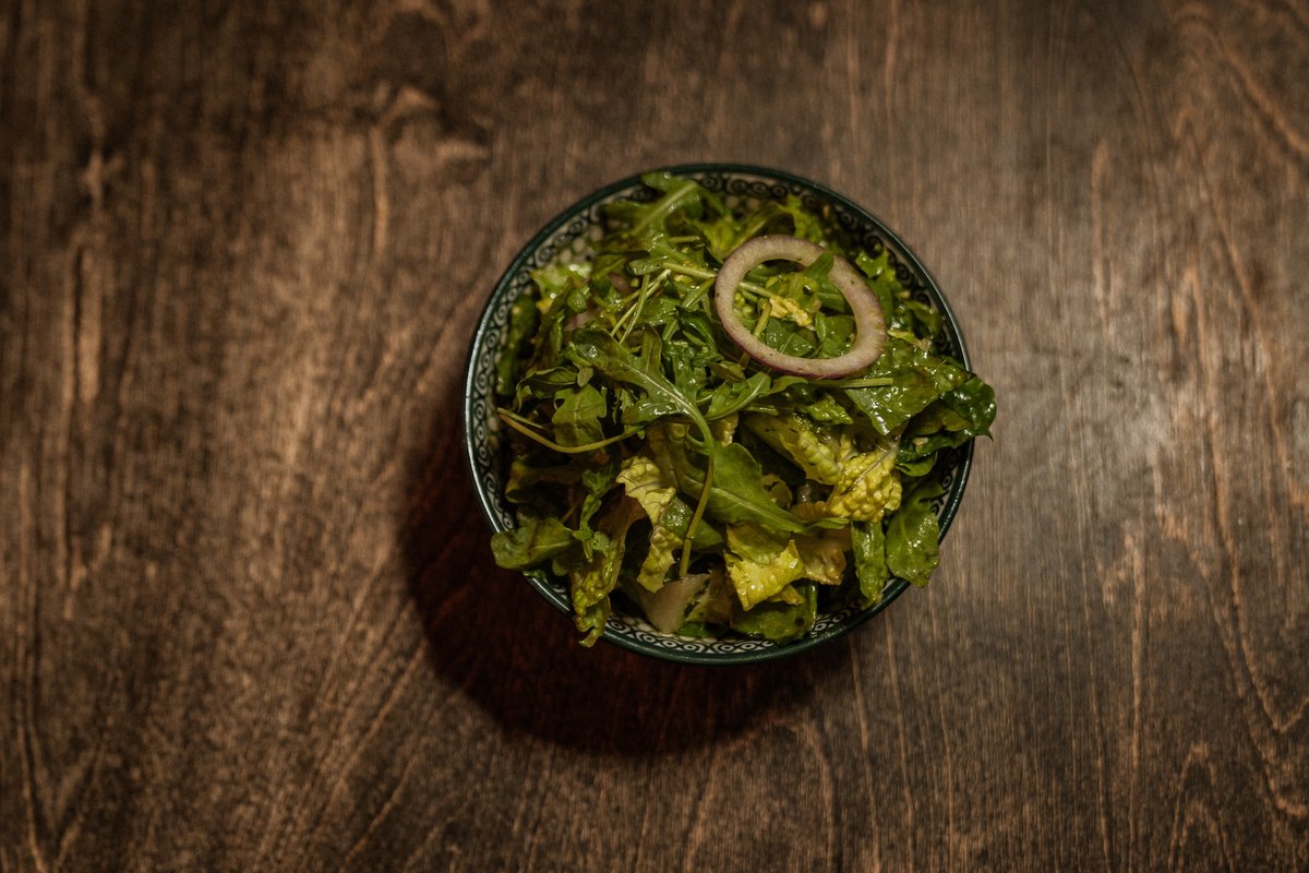 Romaine, red onion, fried portobello, fried aubergine, sesame grissini, rucola, basil pesto